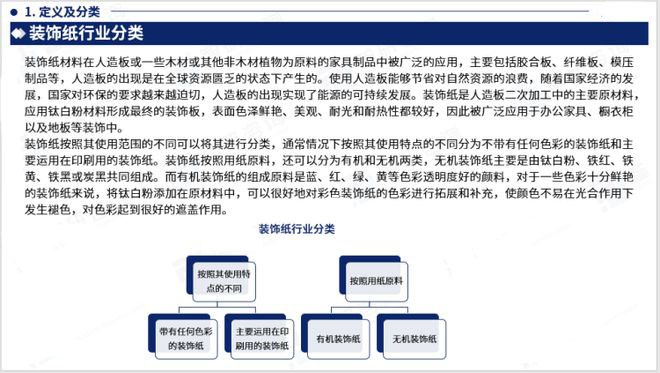 装饰纸材料在人造板或一些木材或其他非木材植物为原料的家具制品中被广泛的应用,主要包括胶合板、纤维板、模压制品等,人造板的出现是在全球资源匮乏的状态下产生的。使用人造板能够节省对自然资源的浪费,随着国家经济的发展,国家对环保的要求越来越迫切,人造板的出现实现了能源的可持续发展。装饰纸是人造板二次加工中的主要原材料,应用钛白粉材料形成最终的装饰板,表面色泽鲜艳、美观、耐光和耐热性都较好,因此被广泛应用于办公家具、橱衣柜以及地板等装饰中。