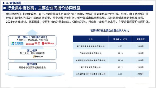 中国特种纸行业起步较晚,以中小型企业居多且区域分布不均衡,整体行业竞争格局比较分散。然而,由于特种纸行业较高的盈利水平以及广阔的市场前景,行业规模迅速扩张,细分领域出现垄断格局。从装饰原纸市场竞争格局来看,2021年齐峰新材、夏王纸业、华旺科技的为行业前三,CR3约70%,行业集中度处于高水平,主要企业间提价协同性强。